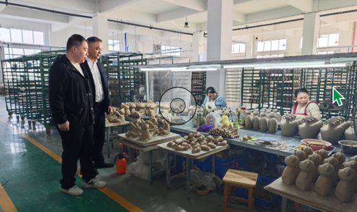 工行景德镇分行工作人员正在走访贝汉美陶瓷生产车间,为其陶瓷生产提供金融支持
