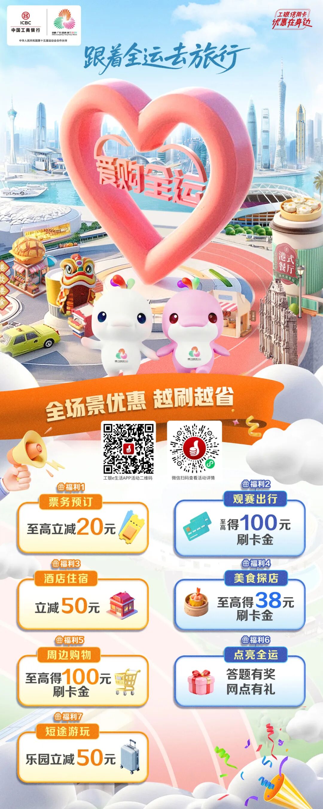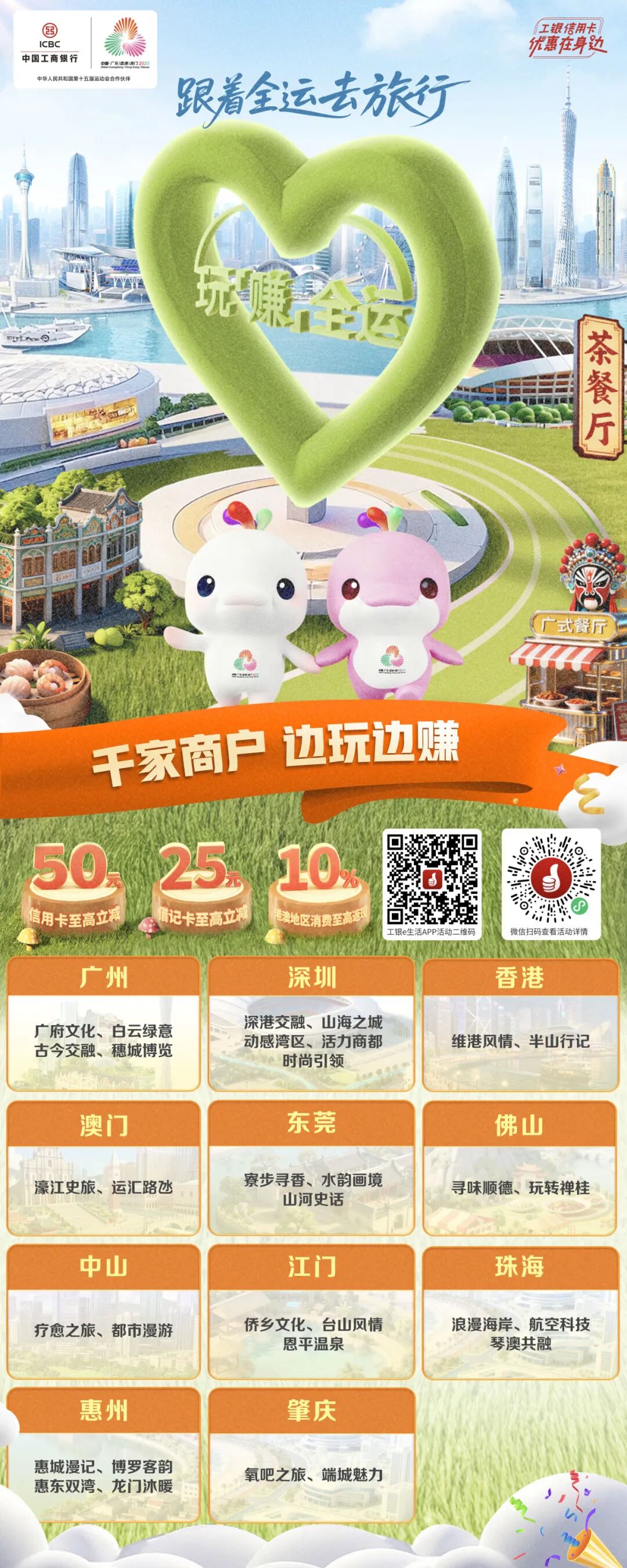 工商银行聚焦十五运会“粤港澳三地联动”办赛特色,进一步延展“文体旅”场景服务半径,打造“赛事引流、消费承接、服务沉淀”的全周期服务生态。围绕客户“观赛、美食、文旅”三大核心需求,工商银行深度挖掘承办与联动城市资源,精心策划“跟着全运去旅行”主题活动,覆盖广州塔、澳门文旅地标、香港特色商圈、顺德美食街巷等热门场景在内的52条全运主题旅行线路,并遴选1000家优质收单商户组建“全运消费联盟”,涵盖赛事场馆便利店、特许商店、餐饮商超、文化场所等,实现“观赛有优惠、出行有便利、消费有实惠”的全场景覆盖。