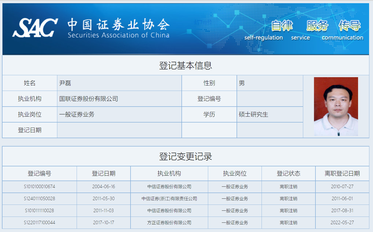 依据中国证券业协会信息,尹磊自2004年至2017年均在中信证券及下属公司任职。