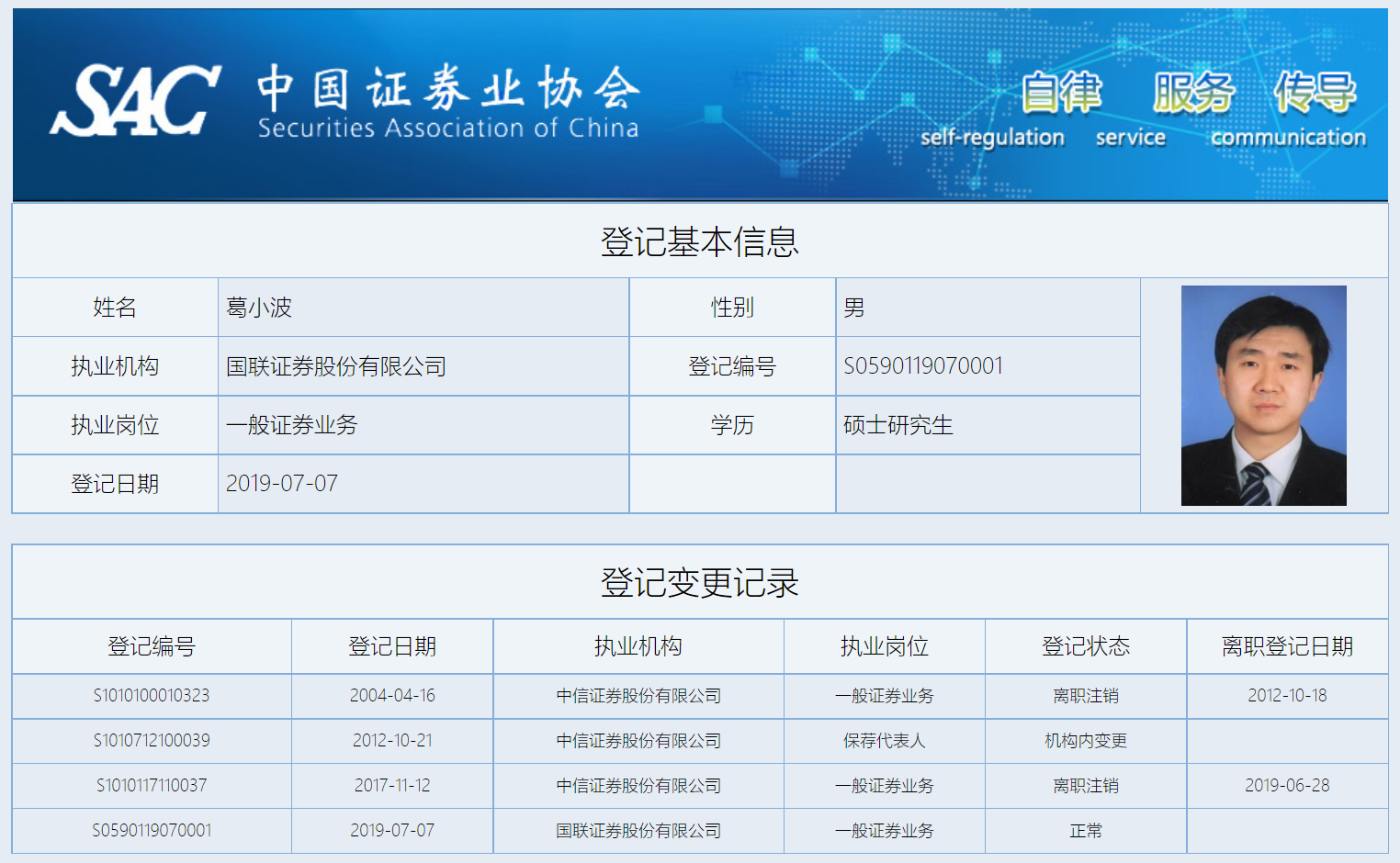 中国证券业协会信息显示,在2019年7月加入国联证券前,葛小波此前的工作经历均在中信证券(600030.SH、06030.HK)。