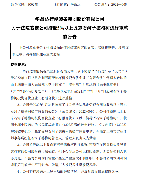 据华昌达智能装备集团股份有限公司(简称:华昌达)公告,公司于2022年11月15日收到德梅柯管理人转达的由十堰市中级人民法院(简称:十堰中院)送达的《民事裁定书》((2022)鄂03破8号之二),裁定自2022年11月7日起对德梅柯进行重整。