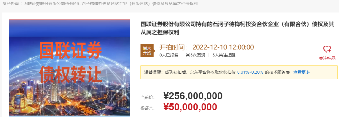 据竞买公告,“国联证券股份有限公司持有的石河子德梅柯投资合伙企业(有限合伙)债权及其从属之担保权利”将于2022年11月18日12时起通过京东网络资产竞价平台上公开竞价,起拍价为2.56亿元。