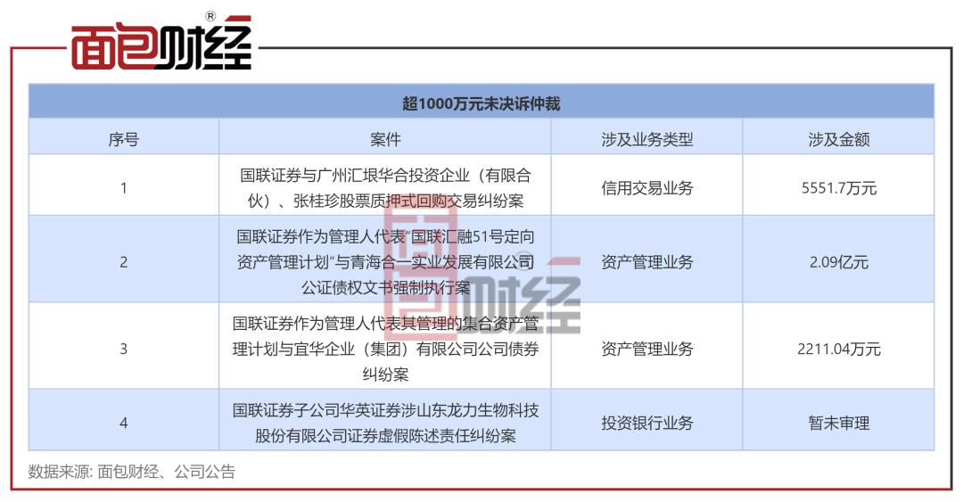 截至国联证券反馈意见回复出具日,国联证券及子公司作为一方当事人涉及4起标的金额超过1000万元的尚未了结的重大诉讼仲裁案件,共涉及金额超2.86亿元。值得注意的是,国联证券子公司华英证券涉山东龙力生物科技股份有限公司证券虚假陈述责任纠纷案件尚在核定损失过程中,标的金额暂不确定,合议庭尚未正式开庭审理。