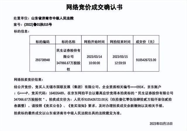 3月15日,在泛海控股集团持有的民生证券34.71亿股股权拍卖中,国联证券第一大股东——无锡市国联发展集团(下称“国联集团”)最终以91.05亿元竞拍成功,相较起拍价溢价55.24%。