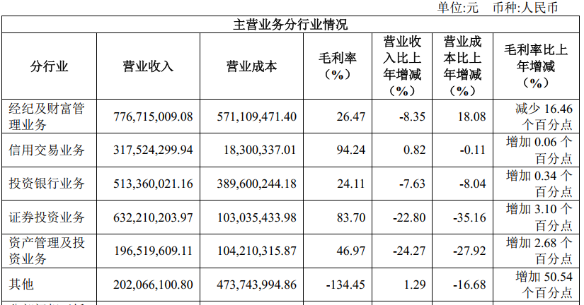 年报显示,2022年国联证券主要业务收入均出现下滑。其中,经纪及财富管理业务实现收入7.77亿元,同比下降 8.35%;投资银行业务实现收入5.13 亿元,同比下降7.63%;证券投资业务实现收入6.32亿元,同比下降22.80%,下滑幅度最大。
