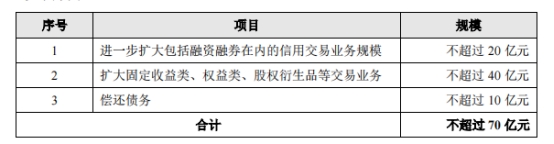 根据申报材料,发行人本次向特定对象发行股票募集资金总额不超过70亿元,全部用于进一步扩大包括融资融券在内的信用交易业务规模,扩大固定收益类、权益类、股权衍生品等交易业务以及偿还债务。