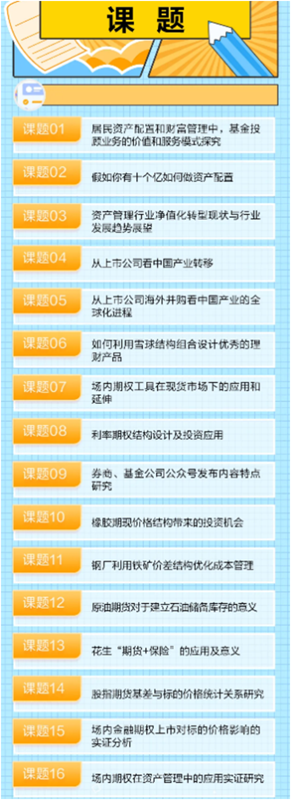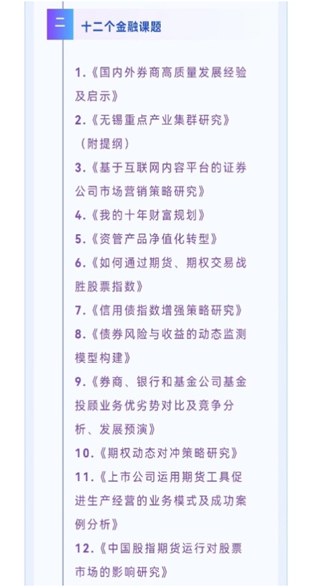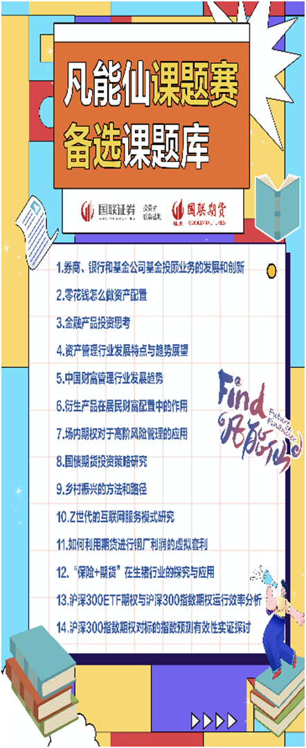课题赛的设立一直是大赛最吸睛的环节,参赛高校可选派5人组成代表队,从公司专家设立的金融证券相关课题库内选择一个课题,开展为期一个月的研讨交流,期间国联业务骨干将担任校外导师,与高校导师共同辅导,帮助在校学生围绕实际问题,开展调查研究,最后通过公开汇报、答辩、评委团评审等方式,选取优秀课题进行评奖,个别优秀成果将推荐给公司业务条线,开展落地实践。