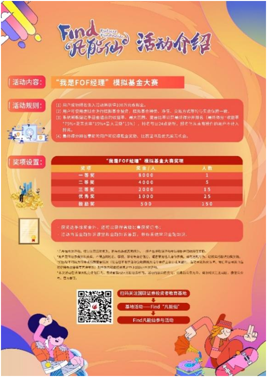 Find“凡能仙”理财高手大赛,前身为国联证券杯大学生理财高手大赛。2020年开始,国联证券将这一开展了三年的赛事,包装升级为Find“凡能仙”品牌,设计灵感源自Find Future Financier(发现未来金融家)的音译,通过沉浸式体验、线上线下同步交流,深度挖掘高校理财能手,营造大学生理财人人都能“露一手”的氛围,打造学子心中财商赛事“新标签”。