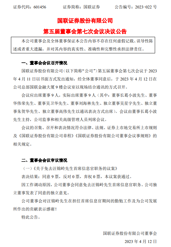 在年报和季报披露的空档期,国联证券于4月11日召开了第五届董事会第七次会议,宣布高管免职事项。