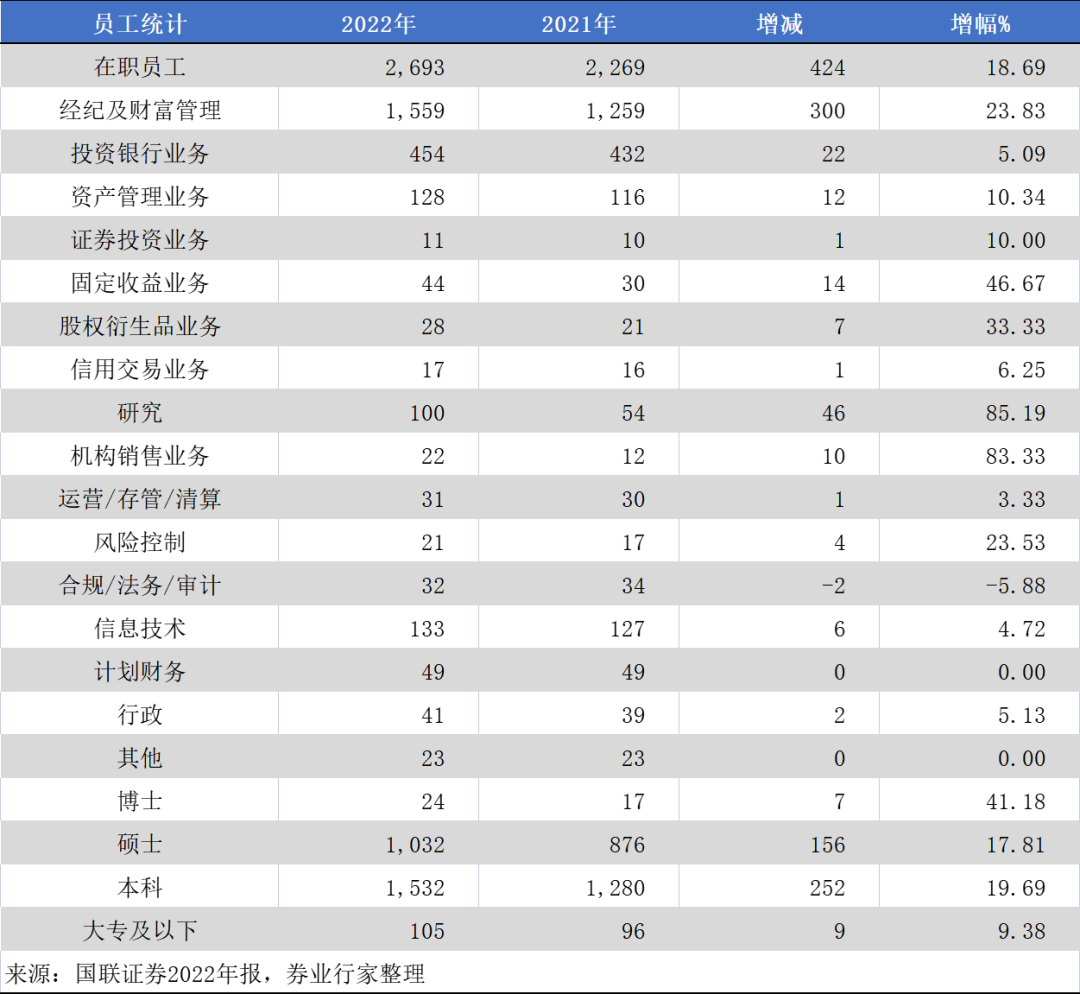 截至2022年底,国联证券共有2,693名员工,同比增长18.69%,主要增量和增幅来自经纪与财富管理、研究业务、机构销售和固收业务。信息技术人员133名,同比增加4.72%;信息技术人员占比,从2021年的5.60%下降至4.94%。