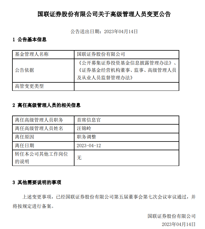 国联证券表示,因工作调动原因,董事会同意免去汪锦岭先生首席信息官职务。并对其任职的勤勉工作及为公司发展所作出的贡献表示感谢。