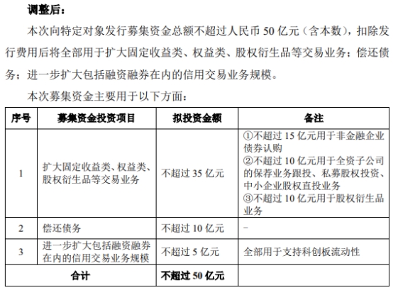 调整后,公司本次向特定对象发行募集资金总额不超过人民币50亿元(含本数),扣除发行费用后将全部用于扩大固定收益类、权益类、股权衍生品等交易业务;偿还债务;进一步扩大包括融资融券在内的信用交易业务规模。