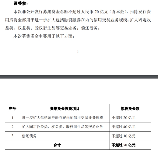 据国联证券公告,调整前,公司本次非公开发行募集资金总额不超过人民币70亿元(含本数),扣除发行费用后将全部用于进一步扩大包括融资融券在内的信用交易业务规模;扩大固定收益类、权益类、股权衍生品等交易业务;偿还债务。