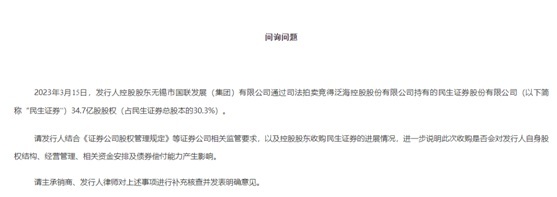 本次问询函则是,针对上交所报送的关于国联证券面向专业投资者公开发行公司债券的相关审核资料,证监会要求国联证券及相关中介机构,就国联证券控股股东国联集团收购民生证券30.3%股权的进展,及可能产生的影响进行补充核查并发表明确意见。