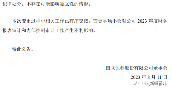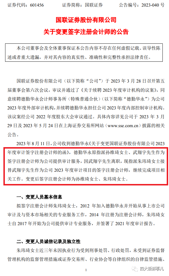 国联证券于8月12日发布的《关于变更签字注册会计师的公告》显示,德勤华永原指派孙维琦女士、武翔宇先生作为签字注册会计师为公司提供审计服务,因武翔宇先生离职,现指派朱玮琦女士接替武翔宇先生作为公司2023年度审计项目的签字注册会计师,继续完成项目相关工作。变更后签字注册会计师为孙维琦女士、朱玮琦女士。