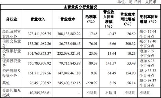 主营业务分行业来看,今年上半年,国联证券六项主营业务中四项毛利率同比减少。其中,国联证券经纪及财富管理业务营业收入3.73亿元,同比减少0.47%,毛利率17.48%,同比减少17.64个百分点;信用交易业务营业收入1.53亿元,同比减少6.66%,毛利率76.01%,同比减少18.40个百分点;投资银行业务营业收入3.02亿元,同比增长13.64%,毛利率23.09%,同比增加2.39个百分点;证券投资业务营业收入7.51亿元,同比增长143.57%,毛利率89.38%,同比增加6.23个百分点;资产管理及投资业务营业收入1.62亿元,同比增长61.49%,毛利率9.07%,同比减少33.32个百分点;其他营业收入7645.17万元,同比增长8.29%,毛利率-220.99%,同比减少98.37个百分点。