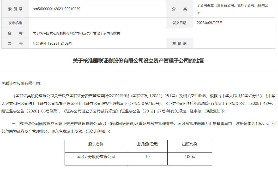 证监会核准国联证券股份有限公司设立资产管理子公司,国联资管注册地为山东省青岛市,注册资本为10亿元,业务范围为证券资产管理业务。
