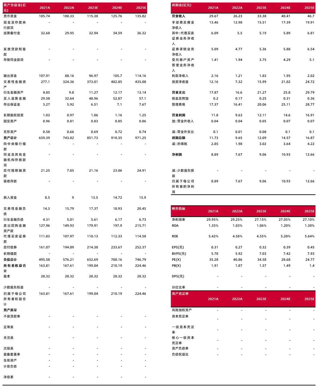 盈利预测、估值分析和投资建议:公司为泛财富管理领先者,区位优势及管理优势显著。预计公司2023年-2025年分别实现营业收入33.38亿元、40.41亿元、46.70亿元。归母净利润9.06亿元、10.93亿元和12.66亿元,增长18.13%、20.58%和15.79%;PB分别为1.57/1.49/1.40,维持“增持-A”评级。