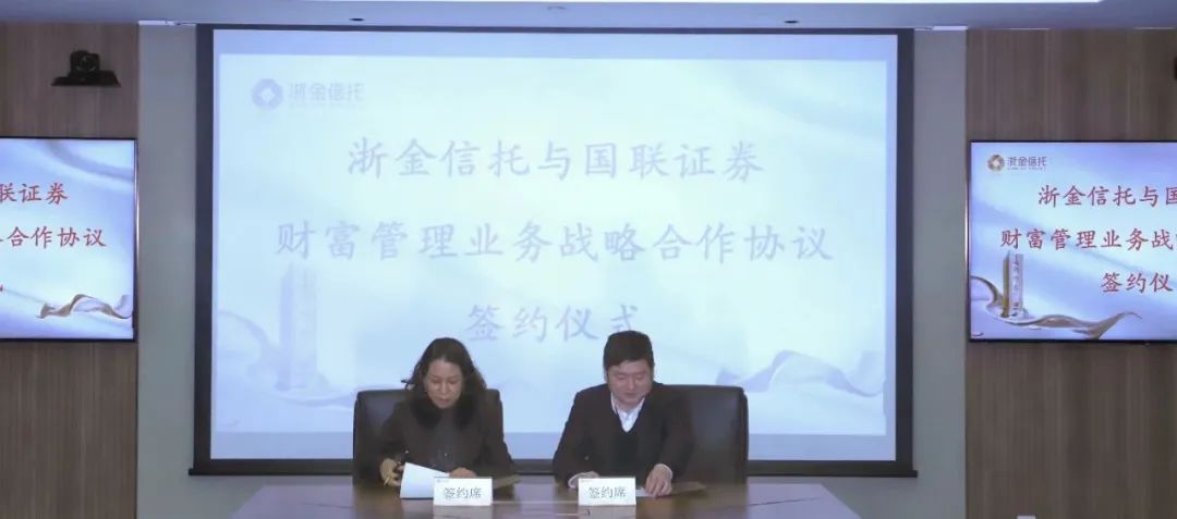 浙金信托公司党委副书记、总经理戴俊与国联证券副总裁尹红卫分别代表双方签署战略合作协议,双方将通过建立紧密的战略合作伙伴关系,在财富管理业务领域深入合作,共同为高净值客户提供包括财富管理、资产配置、家族信托等在内的一站式金融产品和服务。签约仪式上,双方就未来如何开展财富管理业务合作进行了交流。