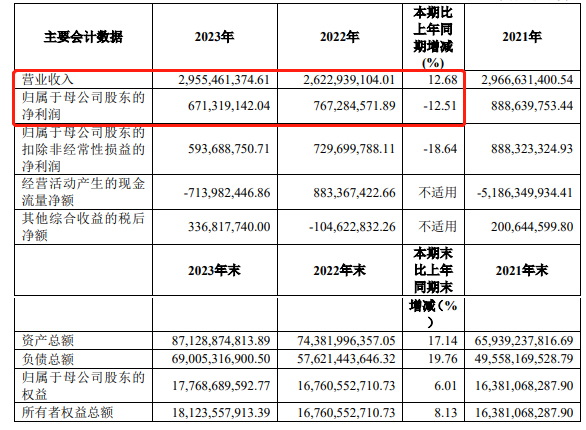 2023全年营业收入为29.55亿元,同比增长12.68%;归母净利润为6.71亿元,同比下降12.51%。