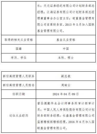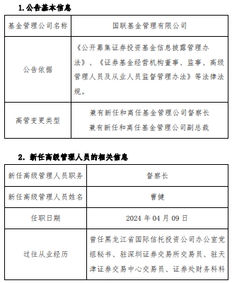 今日,国联基金管理有限公司发布高级管理人员变更公告,曹健离任副总裁职务,转任督察长;周妹云离任督察长职务,转任公司副总裁。同时任命刘鲁旦和马荣荣为副总裁。