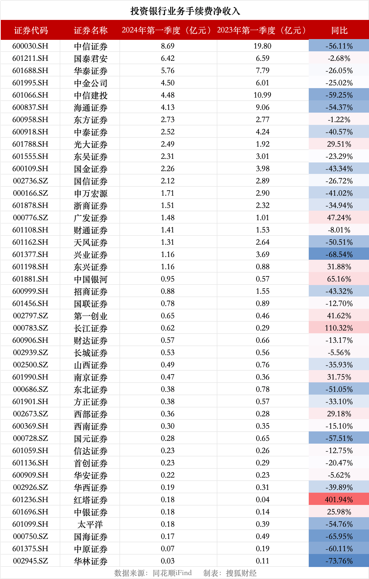 从收入看,一季度投行业务前五名分别为中信证券(8.69亿元)、国泰君安(6.42亿元)、华泰证券(5.76亿元)、中金公司(4.5亿元)、中信建投(4.48亿元),对比去年同期,上述5家投行收入全部下滑,其中中信证券、中信建投均降逾50%。