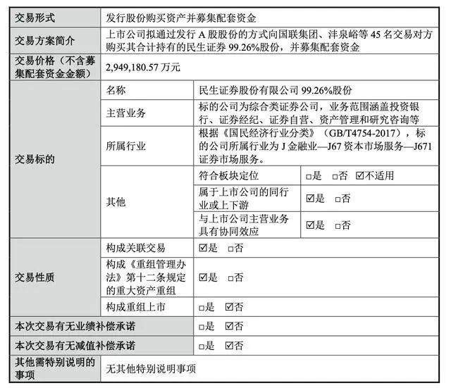 根据公告,国联证券收购民生证券的交易价格294.92亿元,计划通过发行26.4亿股来完成,发行价格为11.17元/股,占发行后上市公司总股本的比例为48.3%(不含配套募资)。