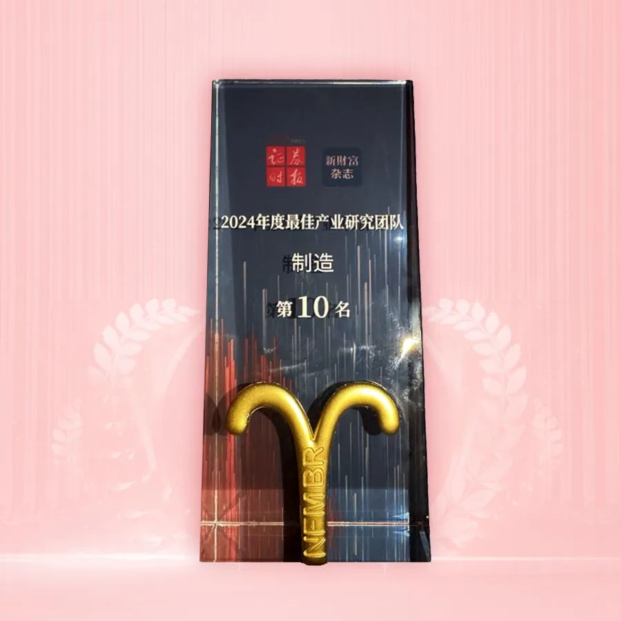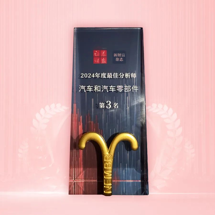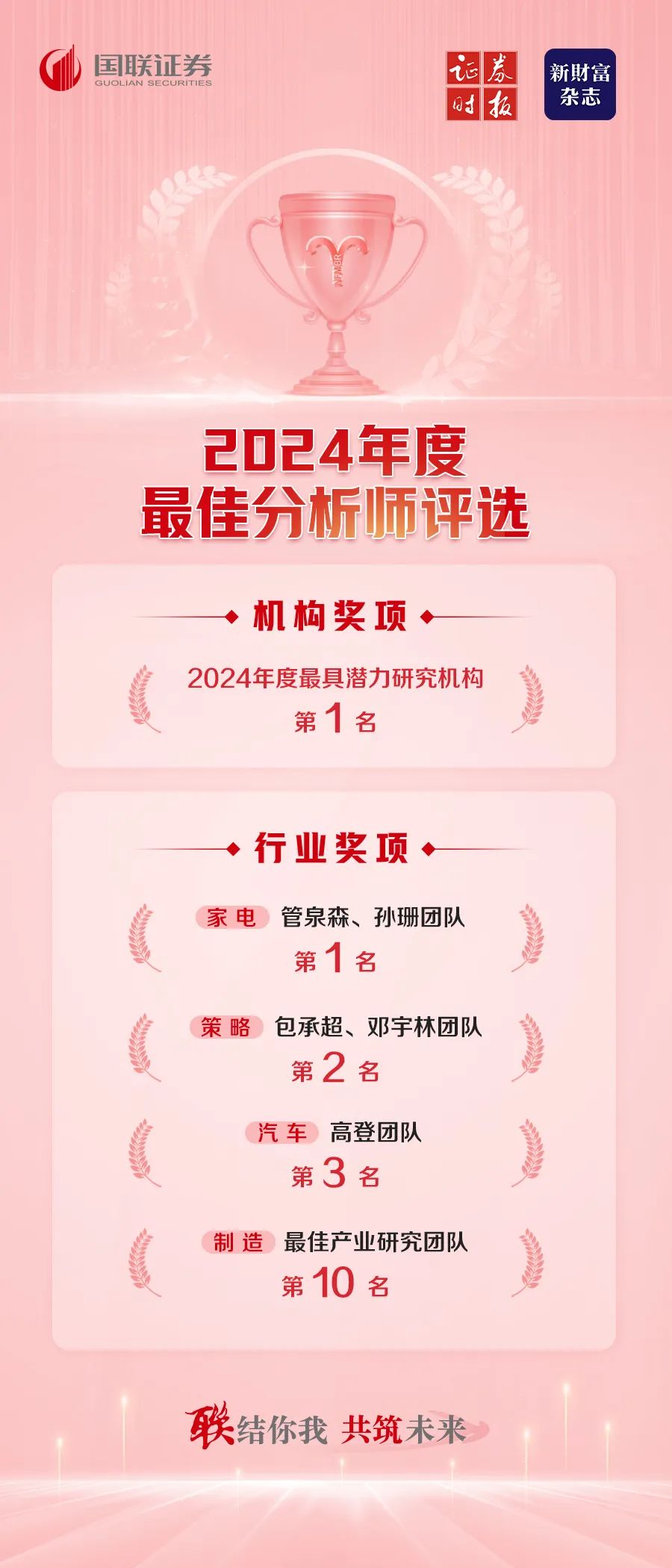 12月24日,由《证券时报》、《新财富》杂志社主办的“2024年度最佳分析师评选”在广州举行颁奖典礼,国联证券荣获“最具潜力研究机构”第一名,“家电行业研究”第一名、“策略研究”第二名、“汽车行业研究”第三名。此外,在产业研究领域获得“制造最佳产业研究团队”第十名。