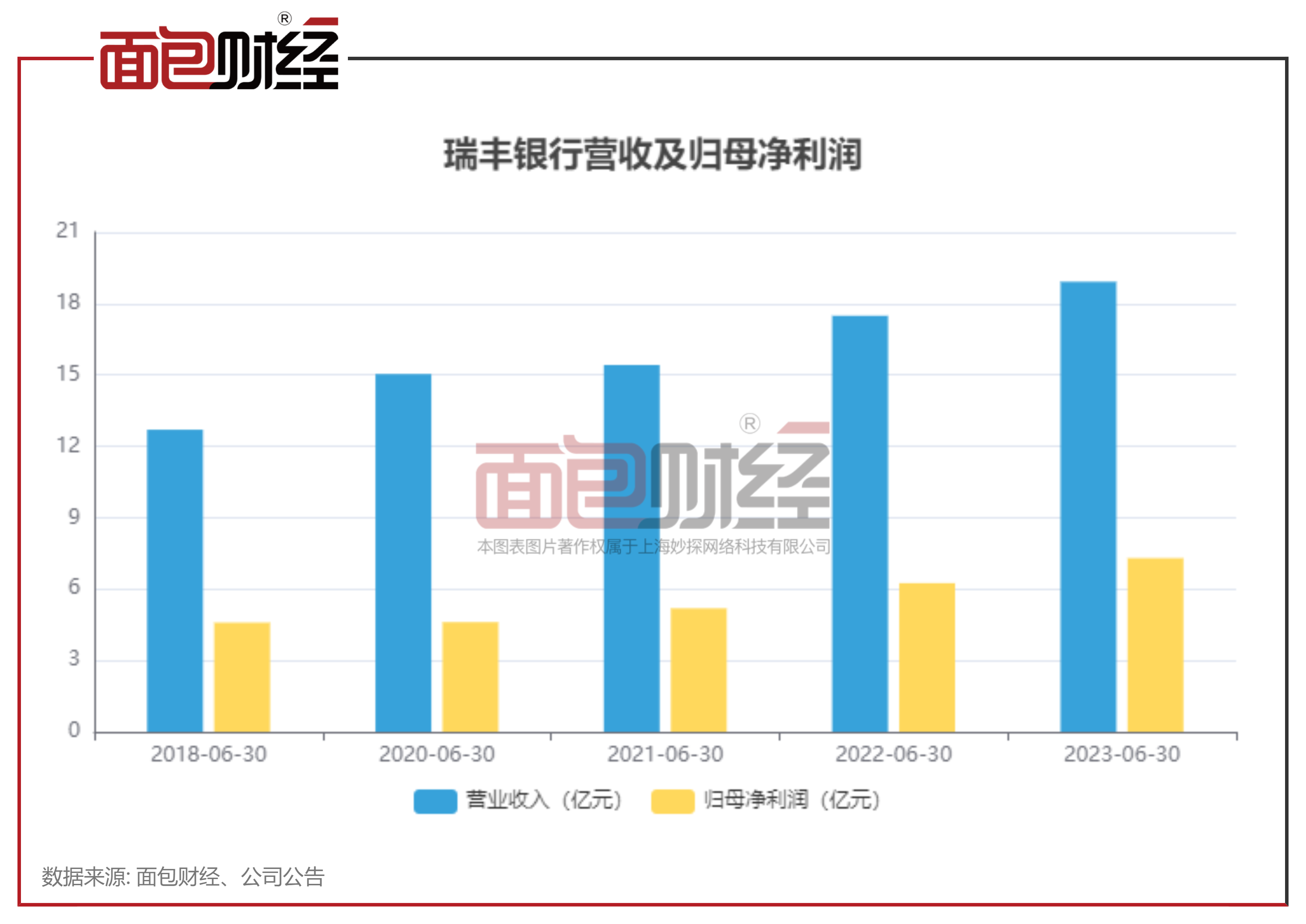 财报显示,2023上半年,瑞丰银行实现营业收入18.92亿元,同比增长8.19%;实现归母净利润7.3亿元,同比增长16.8%。