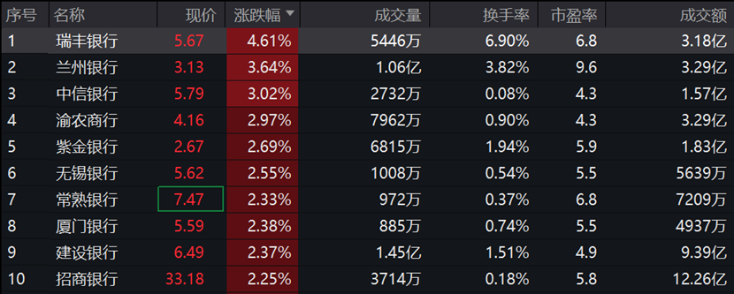 关联指数中证银行指数(399986)成份股中,瑞丰银行领涨4.61%,兰州银行上涨3.64%,中信银行上涨3.02%,渝农银行、紫金银行等股跟涨。