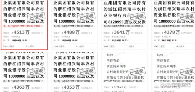 据阿里法拍平台最新披露,11月8日,浙江蓝天实业集团持有瑞丰银行约2812.9万股及派生权益被拆分成两笔1000万股及一笔1812.9万股成功法拍,最终分别被三名自然人抢得。