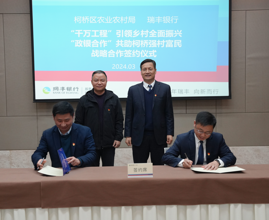 “千万工程”引领乡村全面振兴,“政银合作”共助柯桥强村富民。3月15日上午,瑞丰银行与柯桥区农业农村局举行战略合作签约仪式。瑞丰银行党委书记、董事长吴智晖,柯桥区农业农村局党工委书记、局长裘剑平致辞。
