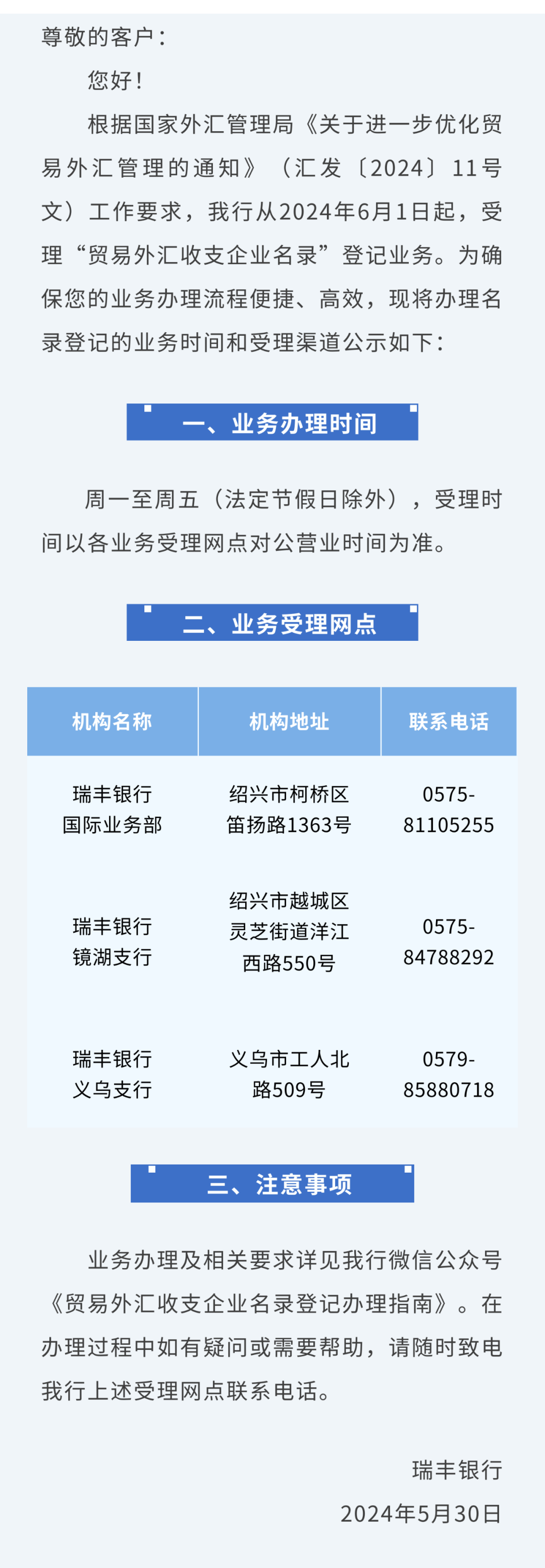 瑞丰银行关于贸易外汇收支企业名录登记业务办理公示