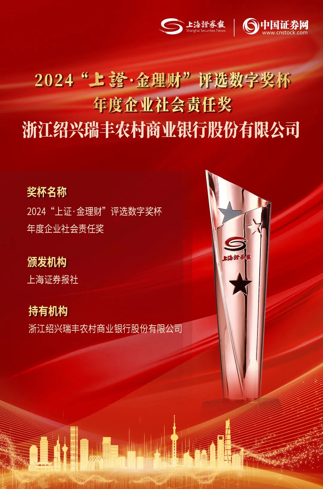 12月21日,在由上海证券报、中国证券网主办的2024上证金融高质量发展大会暨2024上证·金理财评选颁奖典礼上,瑞丰银行(股票代码:601528)斩获2024“上证﹒金理财”年度企业社会责任奖、年度银行财富管理品牌奖两项大奖,其中,瑞丰银行是今年唯一一家入选年度银行财富管理品牌奖的农商行,同时连续两年蝉联此奖项。