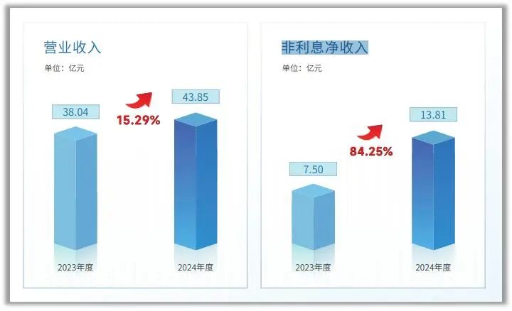 年报数据显示,瑞丰银行2024年非利息净收入同比激增84.25%,达13.81亿元,占营收比重从2023年的19.7%跃升至31.5%。其中,投资收益飙升至9.42亿元,同比暴增100.52%,成为拉动利润增长的核心动力。