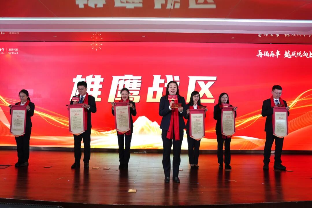 党委委员、副行长秦晓君为“雄鹰战区”越州支行、新城支行、镜湖支行、陶堰支行、富盛支行、城南支行颁发军令状。