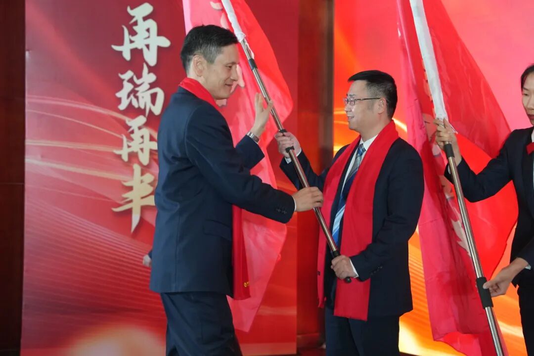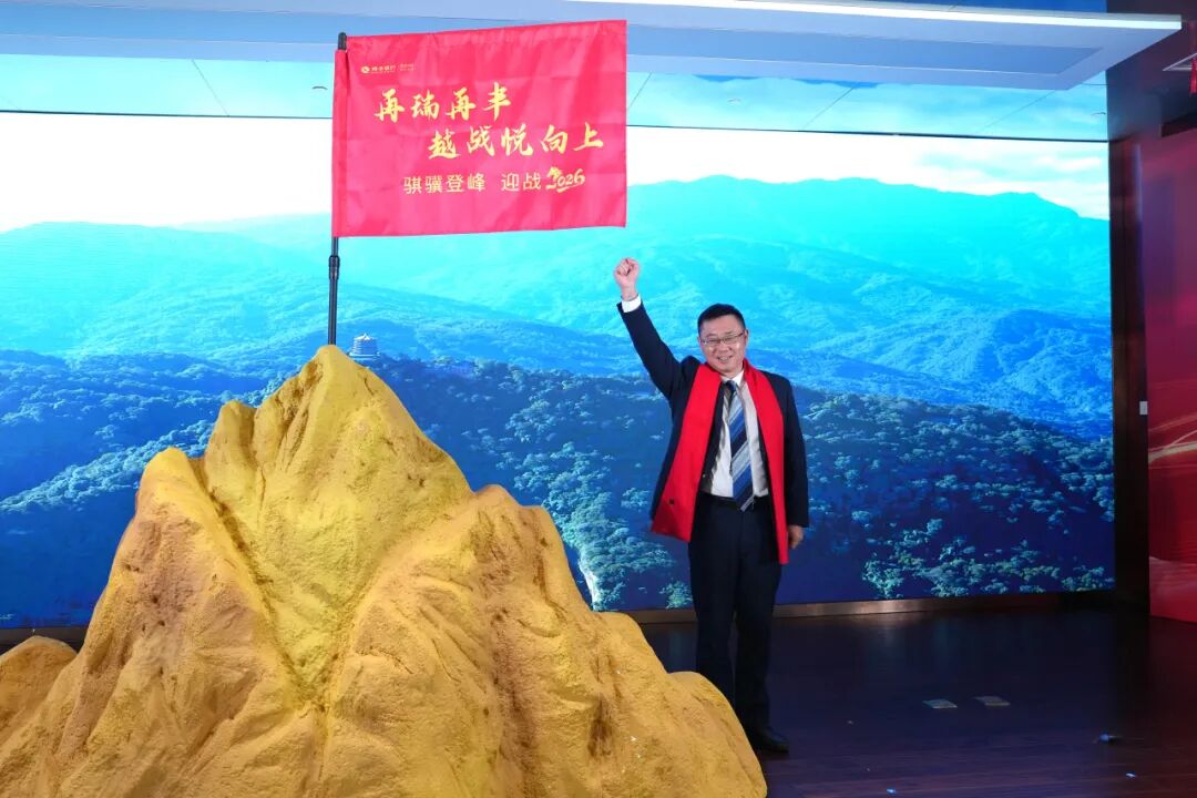 用脚步丈量到巅峰的距离,勇攀高峰的战役已经打响。 瑞丰银行 党委副书记、行长陈钢梁高举战旗,登高插旗,宣示2026开门红战役正式打响。这面旗帜,不仅飘扬在会场之巅,更矗立在每一位瑞丰人的心中——它不是随风扬起,而是用汗水浸透、用信念铸就!这面旗帜,夯实旗开得“胜”的坚定信心,瑞丰的全体将士们将再次挥洒激情,书写更加壮丽的新篇章!