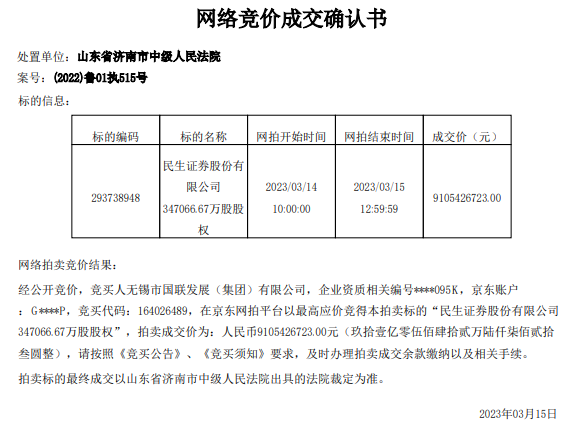 3月15日午间,根据京东法拍平台公告,泛海控股持有的民生证券34.71亿股股权在昨天开启拍卖,起拍价为58.65亿元,最终国联证券(601456)第一大股东无锡市国联发展(集团)以91.05亿元拿下,最终成交价相较于起拍价高了32.4亿元,涨幅高达55.24%。