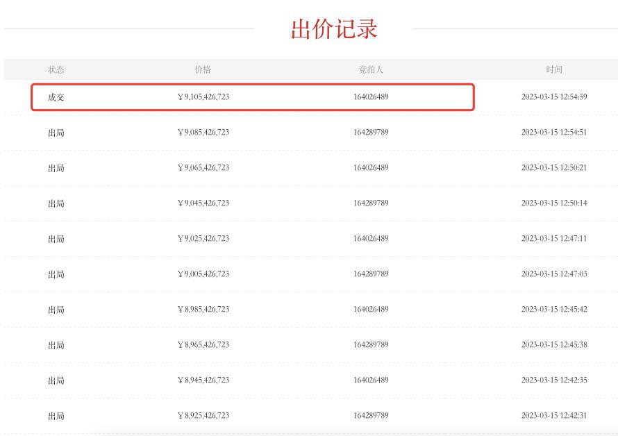 金融小强观察到,从竞价过程来看,一开始,三位买家真可谓是“耐得住性子”,直到昨晚8点才有第一次出价;之后相当胶着;在临近拍卖结束阶段达到高潮。