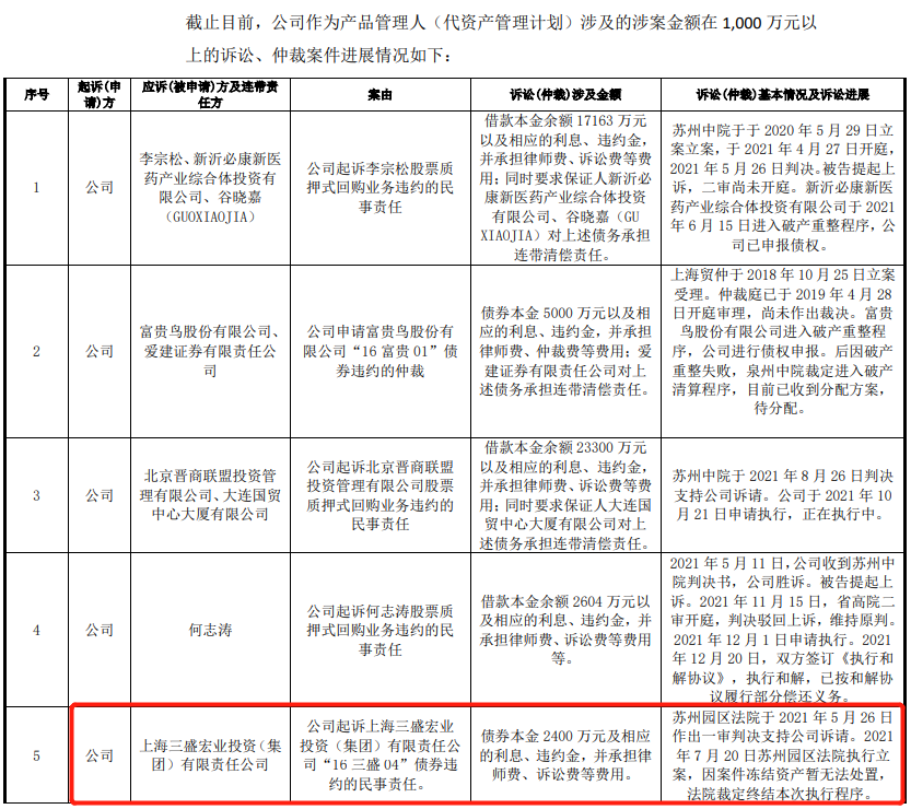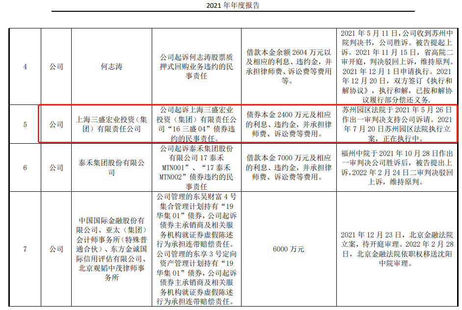 进一步查看,东吴证券2021年年报披露了“作为产品管理人(代资产管理计划)涉及的涉案金额在1,000万元以上的诉讼、仲裁案件进展情况”。在列表中出现了东吴证券起诉三盛宏业“16三盛04”债券违约案,涉诉本金为2400万元。“苏州园区法院于2021年5月26日作出一官判决支持公司诉请。2021年7月20日,苏州园区法院执行立案,正在执行中。”