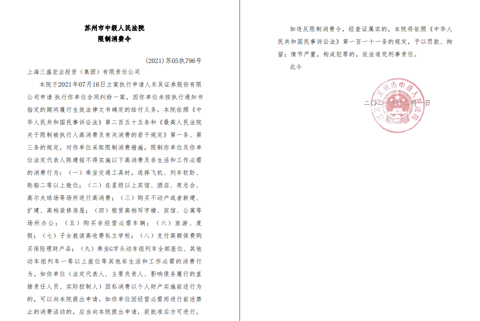 2021年7月16日,苏州中院立案执行申请人东吴证券诉三盛宏业合同纠纷案;同年12月1日,苏州中院出具(2021)苏05执796号限制消费令,对三盛宏业及法定代表人陈建铭“限消”。