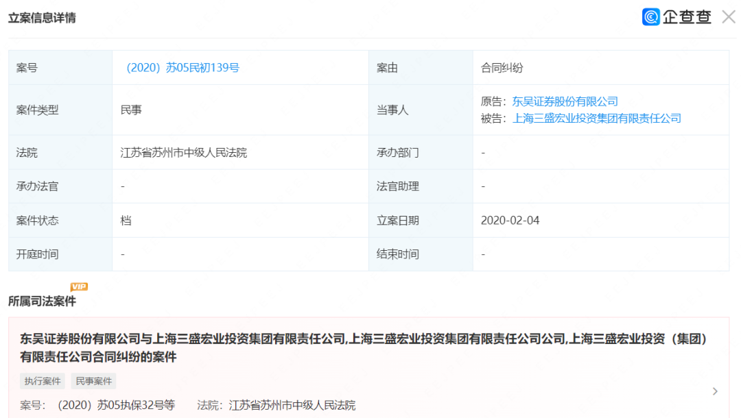 2020年2月4日,苏州市中级人民法院(简称:苏州中院)对东吴证券诉三盛宏业合同纠纷案立案,案号为(2020)苏05民初139号。