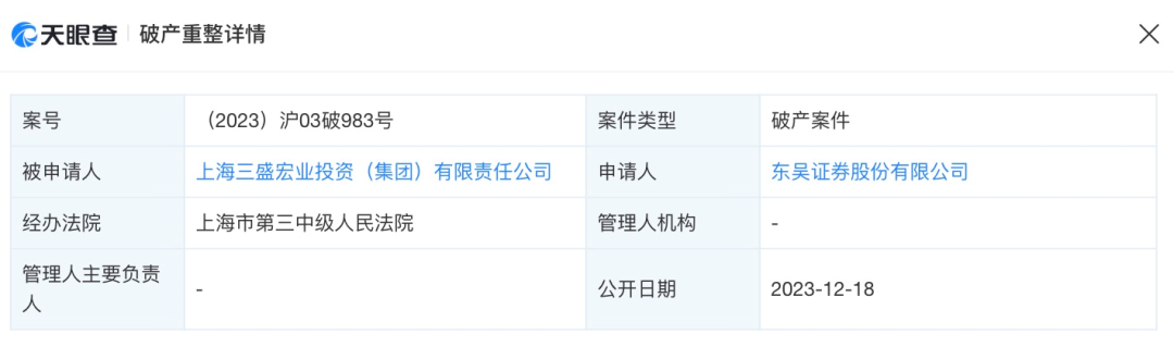12月18日,据公开披露(2023)沪03破983号破产案件。这起案件由上海市第三中级人民法院(简称:上海三中院)经办;申请人为东吴证券,被申请人为上海三盛宏业投资(集团)有限责任公司(简称:三盛宏业)。