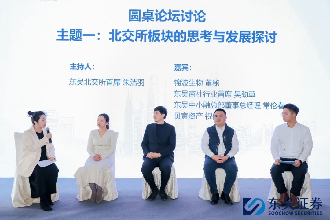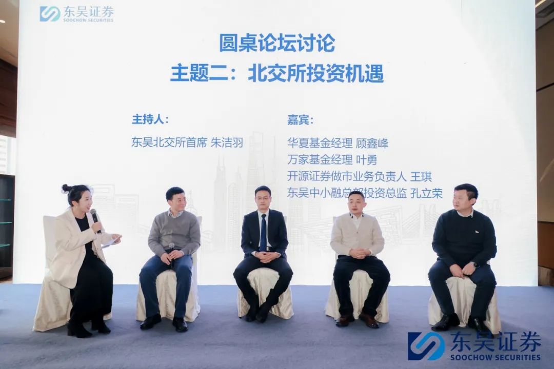 圆桌论坛交流环节,东吴北交所首席朱洁羽对话锦波生物董秘唐梦华、东吴商社行业首席吴劲草、东吴中小企业融资总部董事总经理常伦春、贝寅资产祝侃,共同探讨北交所板块的未来发展。华夏基金经理顾鑫峰、万家基金经理叶勇、开源证券做市业务负责人王琪、东吴中小企业融资总部投资总监孔立荣分享北交所板块投资观点。