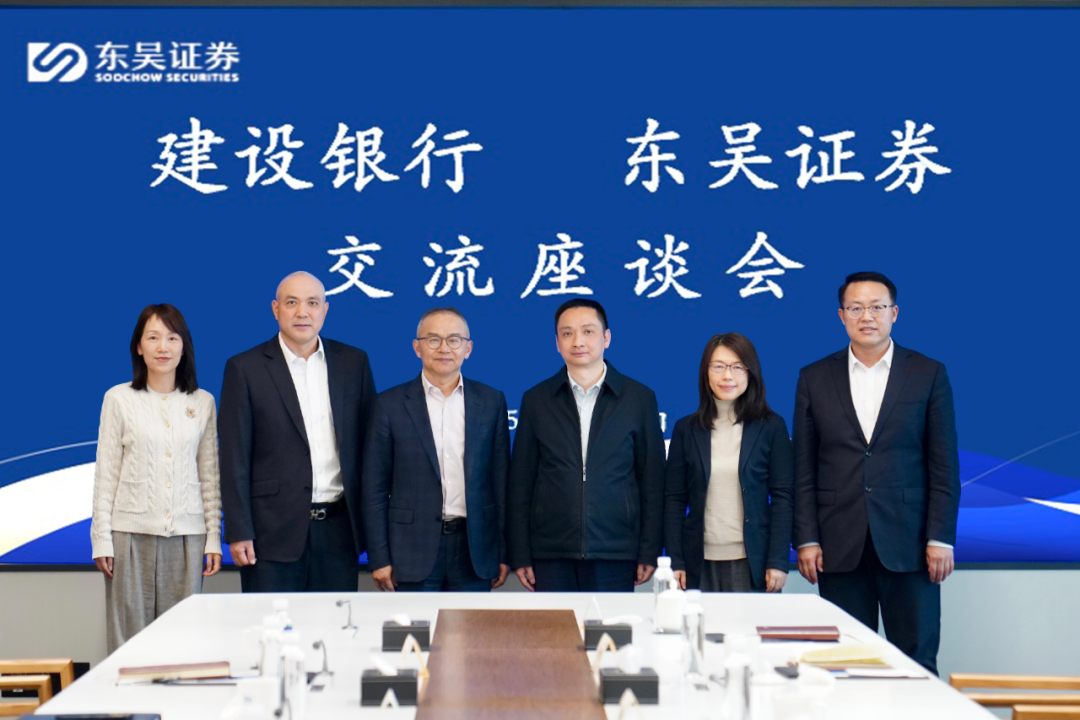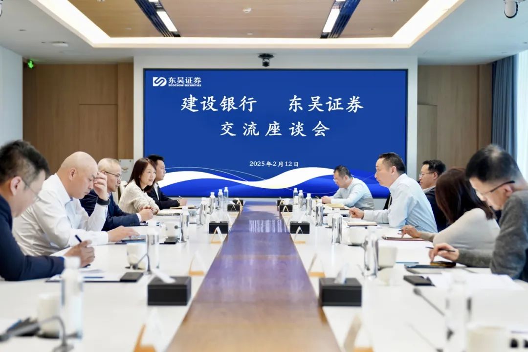 建行苏州分行副行长沈屏炎、梁海涛,东吴证券党委副书记、总裁薛臻,党委委员、副总裁高海明,副总裁姚眺参加座谈。