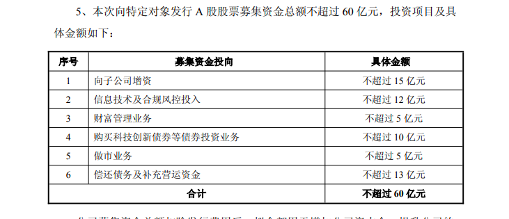 募集资金主要投向六个方面:15亿元将用于向子公司增资,12亿元用于信息技术及合规风控投入,5亿元用于财富管理业务,10亿元用于购买科技创新债券等债券投资业务,5亿元用于做市业务,13亿元用于偿还债务及补充营运资金。