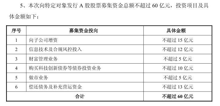 具体来看,将向子公司增资不超过15亿元、信息技术及合规风控投入不超过12亿元、财富管理业务投入不超过5亿元、购买科技创新债券等债券投资业务投入不超过10亿元、做市业务投入不超过5亿元、偿还债务及补充营运资金不超过13亿元。