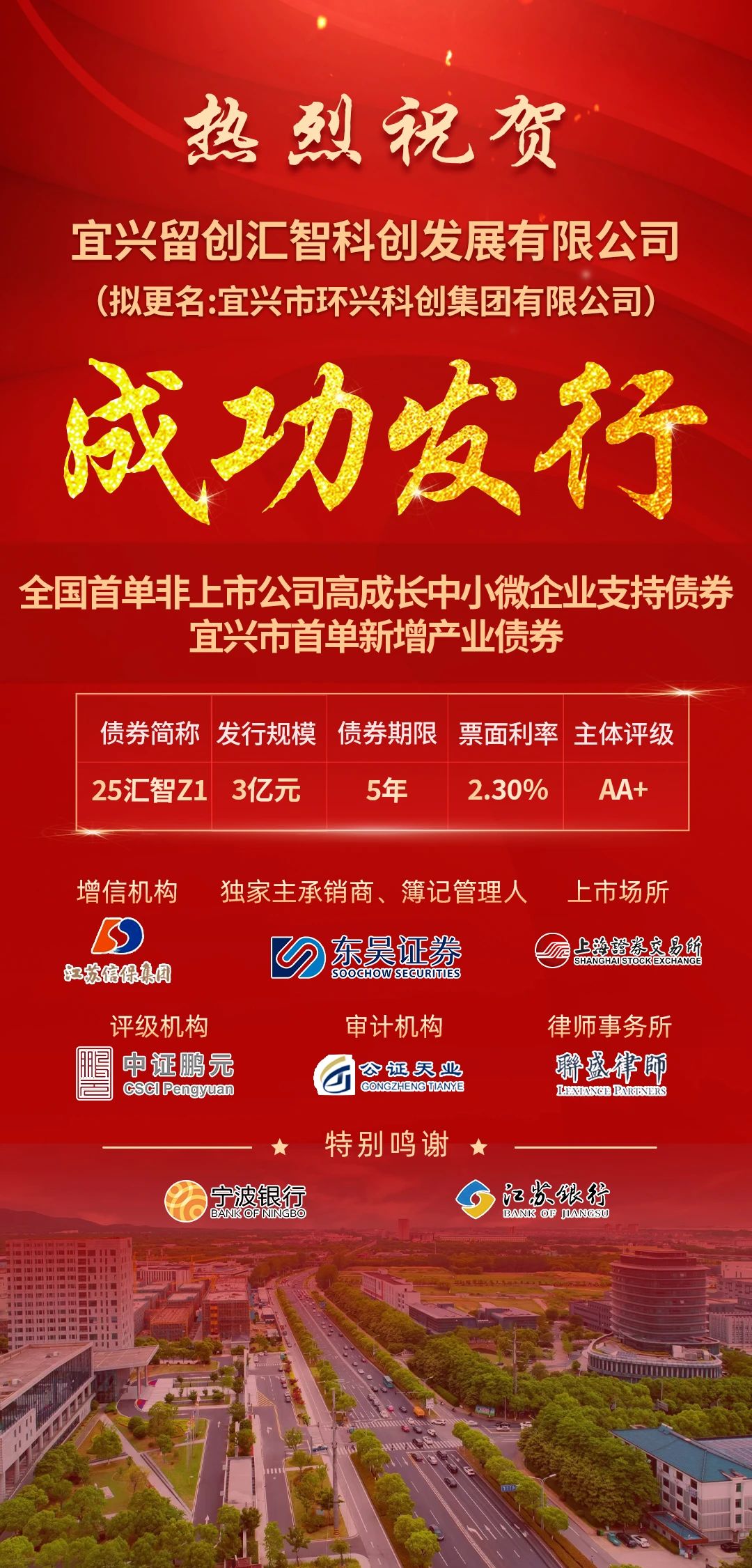 产业兴,则经济兴;产业强,则国家强。2025年8月7日,由东吴证券主承销的宜兴留创汇智科创发展有限公司(拟更名为宜兴市环兴科创集团有限公司)中小微企业支持债券(高成长产业债)在上海证券交易所成功发行。本期债券发行规模为3亿元,发行期限为5年,发行利率为2.3%。