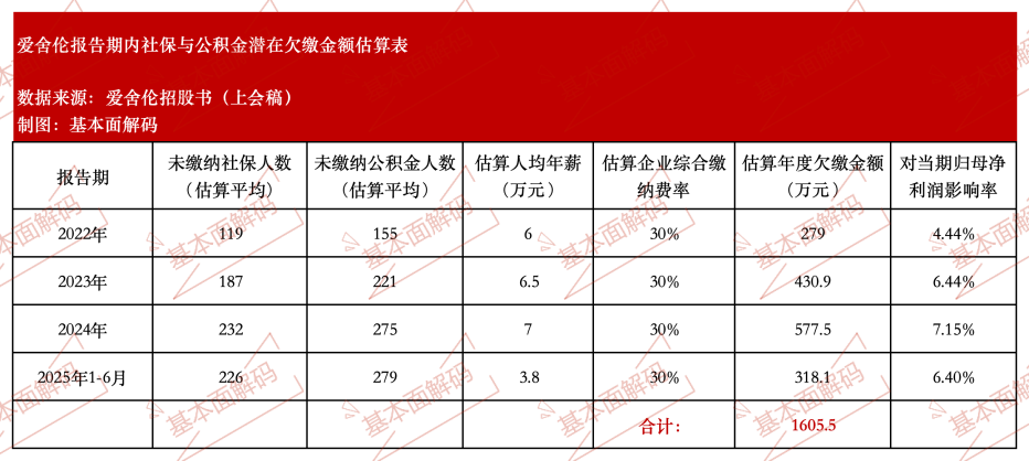 此种操作对财务报表的直接影响或是虚增利润。人工成本是制造业的重要组成部分,社保与公积金的企业缴纳部分通常占到工资总额的30%以上。通过对数百名员工不缴纳或不足额缴纳社保公积金,爱舍伦每年可“节省”巨额成本,这部分被节省的成本直接转化为更高的毛利润和净利润。以下为对报告期内潜在欠缴金额的估算: