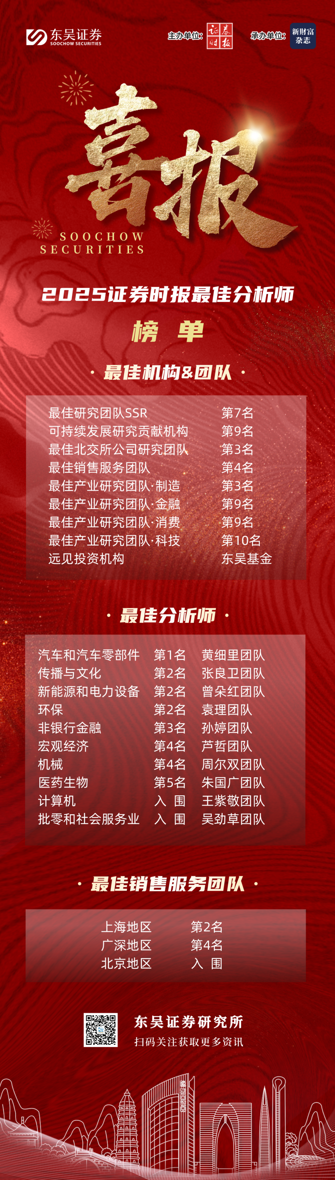 在细分行业领域的评比中, 东吴证券 多个研究团队延续辉煌,强势领跑行业赛道。“汽车和汽车零部件”黄细里团队连续摘得行业第1名桂冠,“新能源和电力设备”曾朵红团队、“传播与文化”张良卫团队、“环保”袁理团队均蝉联行业第2名,“非银行金融”孙婷团队再度荣获行业第3名,“宏观经济”芦哲团队与“机械”周尔双团队位列行业第4名,“医药生物”朱国广团队跻身行业前5名,“计算机”王紫敬团队与“批零与社会服务业”吴劲草团队均成功入围本次评选。